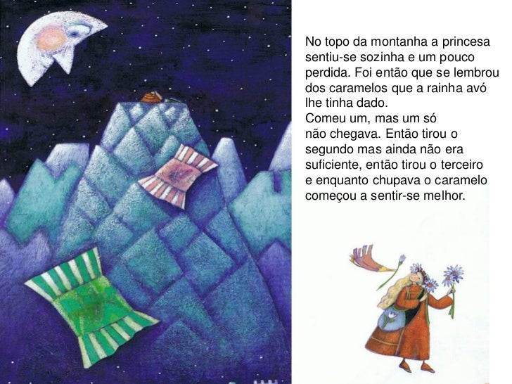 No topo da montanha a princesasentiu-se sozinha e um poucoperdida. Foi então que se lembroudos caramelos que a rainha avól...