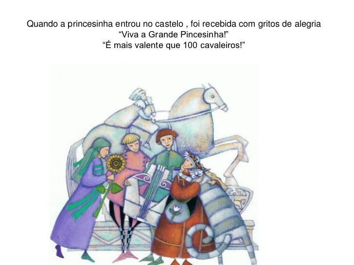 18. 18. Quando a princesinha entrou no castelo , foi recebida com gritos de alegria “Viva a Grande Pincesinha!” “É mais valente que 100 cavaleiros!”
