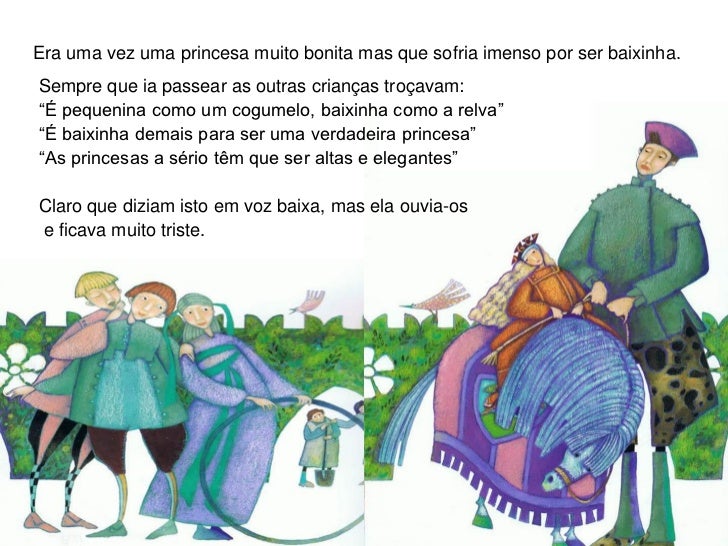 1. 1. Era uma vez uma princesa muito bonita mas que sofria imenso por ser baixinha.Sempre que ia passear as outras crianças troçavam:“É pequenina como um cogumelo, baixinha como a relva”“É baixinha demais para ser uma verdadeira princesa”“As princesas a sério têm que ser altas e elegantes”Claro que diziam isto em voz baixa, mas ela ouvia-ose ficava muito triste.