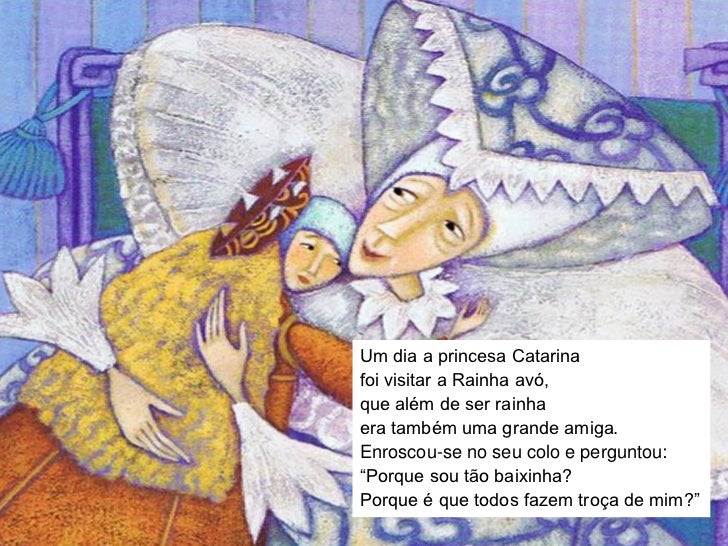 2. 2. Um dia a princesa Catarinafoi visitar a Rainha avó,que além de ser rainhaera também uma grande amiga.Enroscou-se no seu colo e perguntou:“Porque sou tão baixinha?Porque é que todos fazem troça de mim?”