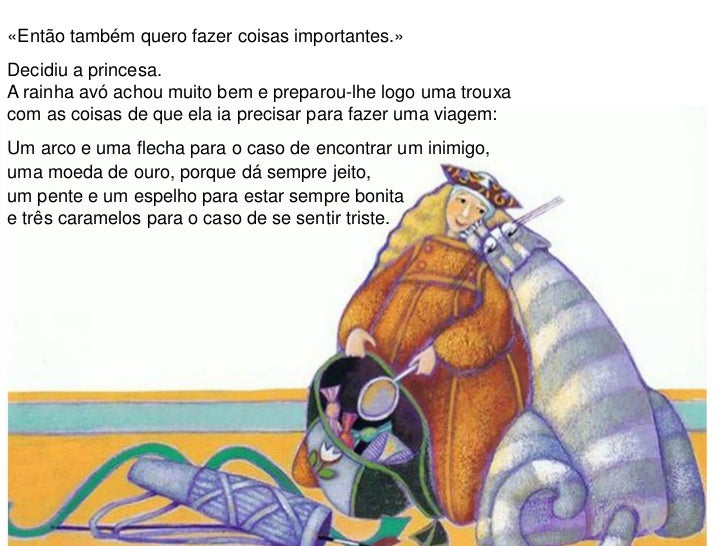4. 4. «Então também quero fazer coisas importantes.»Decidiu a princesa.A rainha avó achou muito bem e preparou-lhe logo uma trouxacom as coisas de que ela ia precisar para fazer uma viagem:Um arco e uma flecha para o caso de encontrar um inimigo,uma moeda de ouro, porque dá sempre jeito,um pente e um espelho para estar sempre bonitae três caramelos para o caso de se sentir triste.