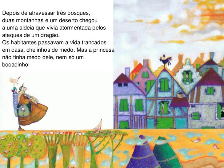 5. 5. Depois de atravessar três bosques,duas montanhas e um deserto chegoua uma aldeia que vivia atormentada pelosataques de um dragão.Os habitantes passavam a vida trancadosem casa, cheiinhos de medo. Mas a princesanão tinha medo dele, nem só umbocadinho!