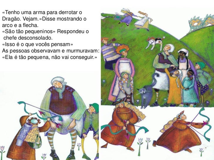 6. 6. «Tenho uma arma para derrotar oDragão. Vejam.»Disse mostrando oarco e a flecha.«São tão pequeninos» Respondeu ochefe desconsolado.«Isso é o que vocês pensam»As pessoas observavam e murmuravam:«Ela é tão pequena, não vai conseguir.»