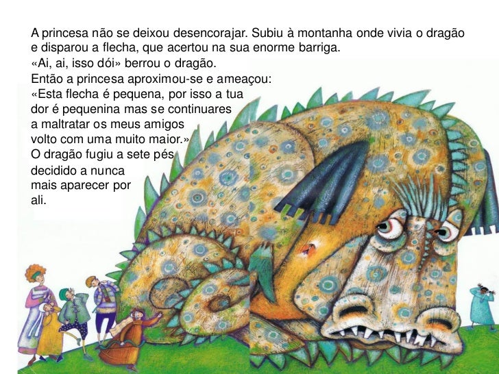 A princesa não se deixou desencorajar. Subiu à montanha onde vivia o dragãoe disparou a flecha, que acertou na sua enorme ...
