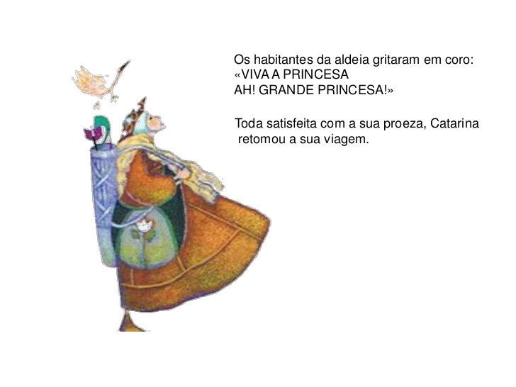 8. 8. Os habitantes da aldeia gritaram em coro:«VIVA A PRINCESAAH! GRANDE PRINCESA!»Toda satisfeita com a sua proeza, Catarina retomou a sua viagem.