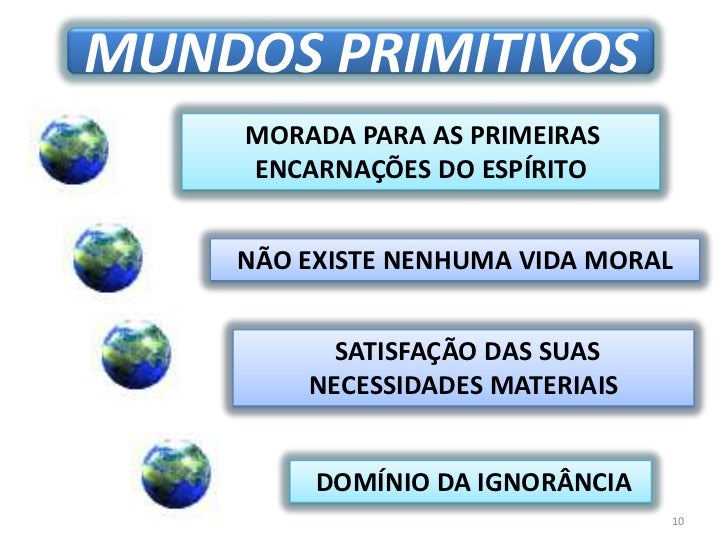 10. 10. 10<br />MUNDOS PRIMITIVOS<br />MORADA PARA AS PRIMEIRAS ENCARNAÇÕES DO ESPÍRITO <br />NÃO EXISTE NENHUMA VIDA MORAL<br />SATISFAÇÃO DAS SUAS NECESSIDADES MATERIAIS<br /> DOMÍNIO DA IGNORÂNCIA<br />