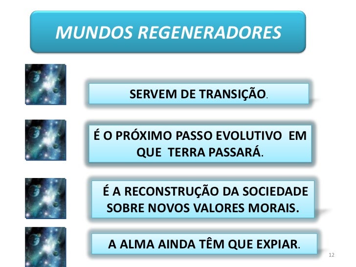 12. 12. 12<br />MUNDOS REGENERADORES<br />SERVEM DE TRANSIÇÃO.<br />É O PRÓXIMO PASSO EVOLUTIVO EM QUE TERRA PASSARÁ.<br />É A RECONSTRUÇÃO DA SOCIEDADE SOBRE NOVOS VALORES MORAIS. <br />A ALMA AINDA TÊM QUE EXPIAR.<br />