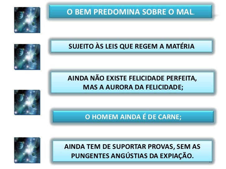 13. 13. 13<br />O BEM PREDOMINA SOBRE O MAL.<br />SUJEITO ÀS LEIS QUE REGEM A MATÉRIA<br />AINDA NÃO EXISTE FELICIDADE PERFEITA,<br /> MAS A AURORA DA FELICIDADE;<br />O HOMEM AINDA É DE CARNE;<br />AINDA TEM DE SUPORTAR PROVAS, SEM AS PUNGENTES ANGÚSTIAS DA EXPIAÇÃO.<br />