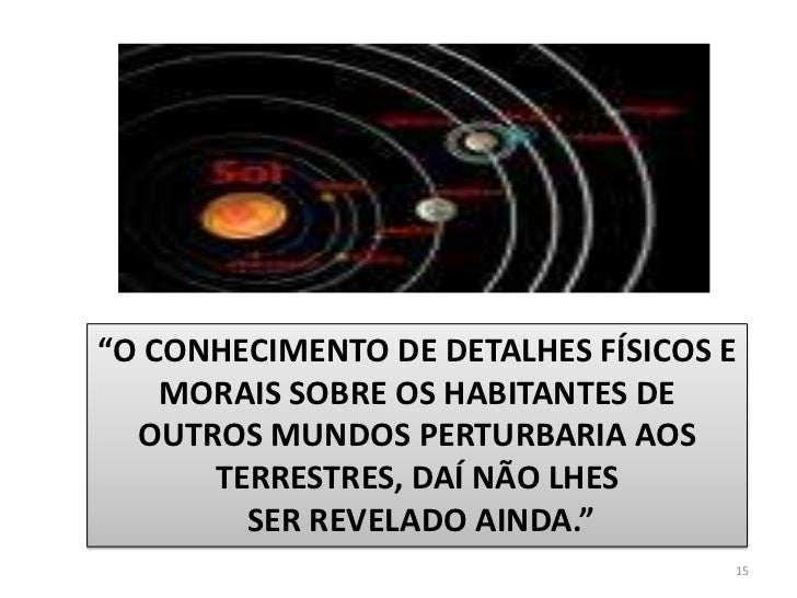 15. 15. 15<br />“O CONHECIMENTO DE DETALHES FÍSICOS E MORAIS SOBRE OS HABITANTES DE OUTROS MUNDOS PERTURBARIA AOS TERRESTRES, DAÍ NÃO LHES<br /> SER REVELADO AINDA.”<br />