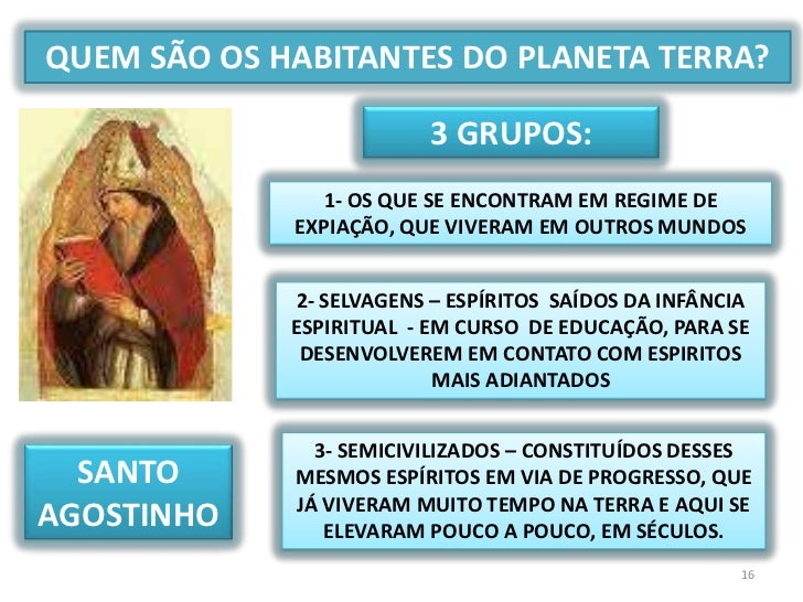 16. 16. 16<br />QUEM SÃO OS HABITANTES DO PLANETA TERRA? <br />3 GRUPOS:<br />1- OS QUE SE ENCONTRAM EM REGIME DE EXPIAÇÃO, QUE VIVERAM EM OUTROS MUNDOS<br />2- SELVAGENS – ESPÍRITOS SAÍDOS DA INFÂNCIA ESPIRITUAL - EM CURSO DE EDUCAÇÃO, PARA SE DESENVOLVEREM EM CONTATO COM ESPIRITOS MAIS ADIANTADOS<br />3- SEMICIVILIZADOS – CONSTITUÍDOS DESSES MESMOS ESPÍRITOS EM VIA DE PROGRESSO, QUE JÁ VIVERAM MUITO TEMPO NA TERRA E AQUI SE ELEVARAM POUCO A POUCO, EM SÉCULOS. <br />SANTO AGOSTINHO<br />