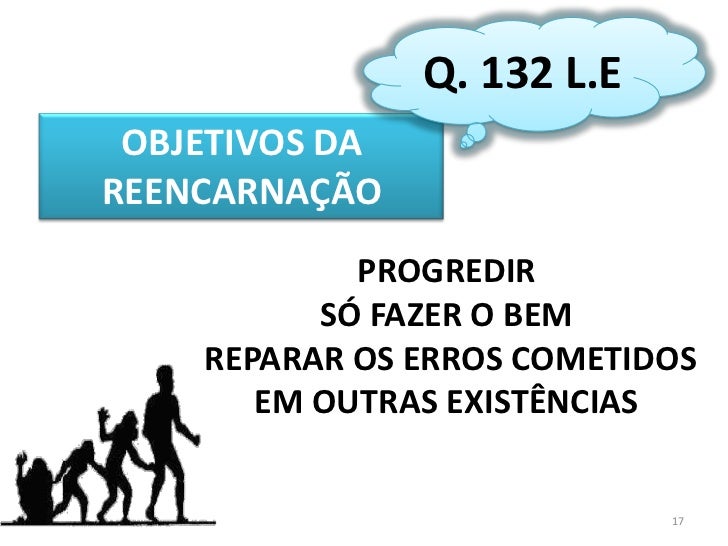 17. 17. 17<br />Q. 132 L.E<br />OBJETIVOS DA REENCARNAÇÃO<br />PROGREDIR<br />SÓ FAZER O BEM <br />REPARAR OS ERROS COMETIDOS EM OUTRAS EXISTÊNCIAS<br />