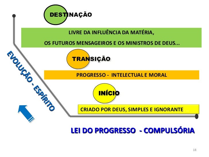 18. 18. DESTINAÇÃO<br />EVOLUÇÃO - ESPÍRITO<br />LIVRE DA INFLUÊNCIA DA MATÉRIA, <br /> OS FUTUROS MENSAGEIROS E OS MINISTROS DE DEUS...<br />TRANSIÇÃO<br />PROGRESSO - INTELECTUAL E MORAL <br />INÍCIO<br />CRIADO POR DEUS, SIMPLES E IGNORANTE. ..<br />LEI DO PROGRESSO - COMPULSÓRIA<br />18<br />