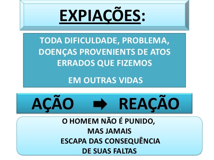 22. 22. 22<br />EXPIAÇÕES:<br />TODA DIFICULDADE, PROBLEMA, DOENÇAS PROVENIENTS DE ATOS ERRADOS QUE FIZEMOS<br /> EM OUTRAS VIDAS <br />AÇÃO REAÇÃO. <br />O HOMEM NÃO É PUNIDO, <br />MAS JAMAIS<br /> ESCAPA DAS CONSEQUÊNCIA<br />DE SUAS FALTAS <br />