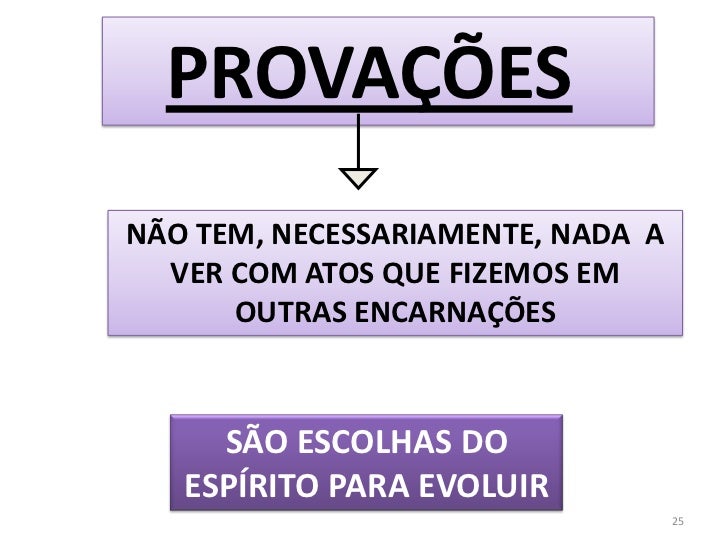 25. 25. 25<br />PROVAÇÕES<br />NÃO TEM, NECESSARIAMENTE, NADA A VER COM ATOS QUE FIZEMOS EM OUTRAS ENCARNAÇÕES<br />SÃO ESCOLHAS DO ESPÍRITO PARA EVOLUIR<br />
