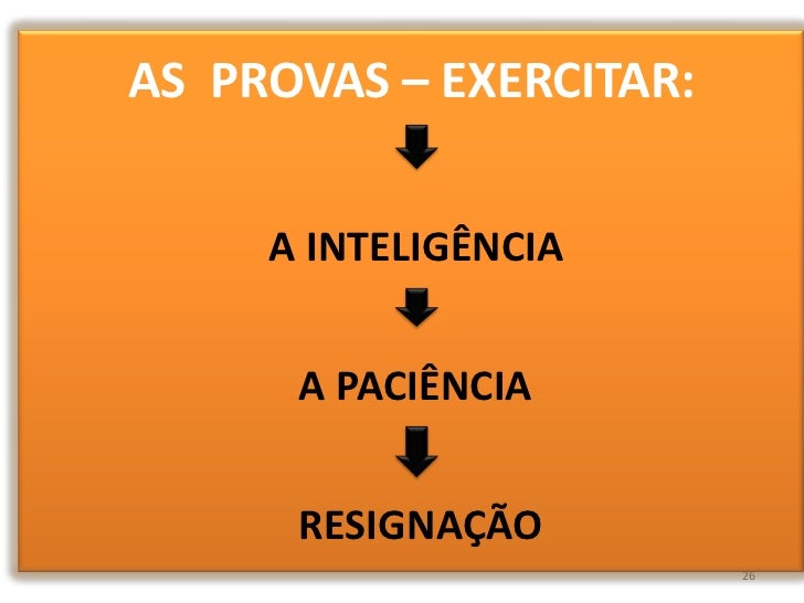 26. 26. 26<br />AS PROVAS – EXERCITAR:<br />A INTELIGÊNCIA<br />A PACIÊNCIA<br /> RESIGNAÇÃO<br />