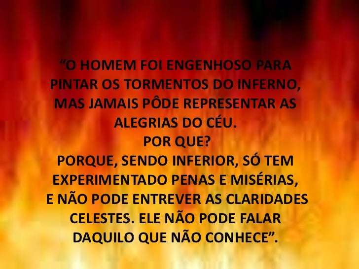 27. 27. 27<br />“O HOMEM FOI ENGENHOSO PARA PINTAR OS TORMENTOS DO INFERNO, MAS JAMAIS PÔDE REPRESENTAR AS ALEGRIAS DO CÉU. <br /> POR QUE?<br />PORQUE, SENDO INFERIOR, SÓ TEM EXPERIMENTADO PENAS E MISÉRIAS,<br /> E NÃO PODE ENTREVER AS CLARIDADES CELESTES. ELE NÃO PODE FALAR DAQUILO QUE NÃO CONHECE”.<br />