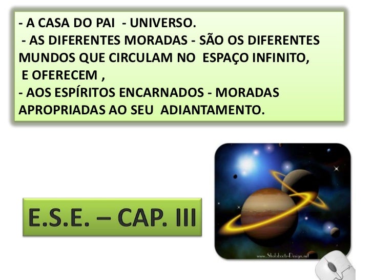 3. 3. - A CASA DO PAI - UNIVERSO.<br /> - AS DIFERENTES MORADAS - SÃO OS DIFERENTES MUNDOS QUE CIRCULAM NO ESPAÇO INFINITO,<br /> E OFERECEM ,<br />- AOS ESPÍRITOS ENCARNADOS - MORADAS APROPRIADAS AO SEU ADIANTAMENTO.<br />E.S.E. – CAP. III<br />3<br />