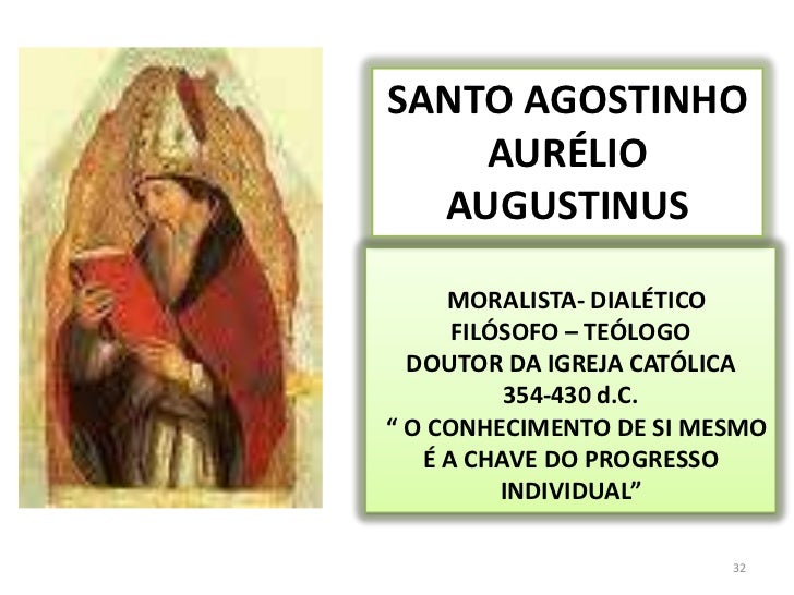 32. 32. 32<br />SANTO AGOSTINHO<br />AURÉLIO AUGUSTINUS<br /> MORALISTA- DIALÉTICO<br />FILÓSOFO – TEÓLOGO<br />DOUTOR DA IGREJA CATÓLICA <br />354-430 d.C. <br /> “ O CONHECIMENTO DE SI MESMO É A CHAVE DO PROGRESSO INDIVIDUAL”<br />