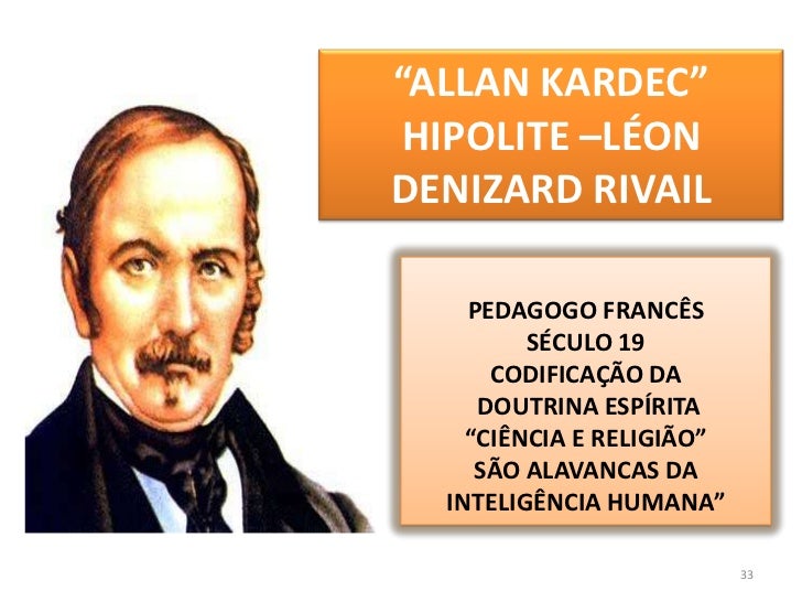 33. 33. 33<br />“ALLAN KARDEC”<br />HIPOLITE –LÉON DENIZARD RIVAIL<br />PEDAGOGO FRANCÊS<br />SÉCULO 19<br />CODIFICAÇÃO DA<br /> DOUTRINA ESPÍRITA<br />“CIÊNCIA E RELIGIÃO”<br />SÃO ALAVANCAS DA INTELIGÊNCIA HUMANA”<br />