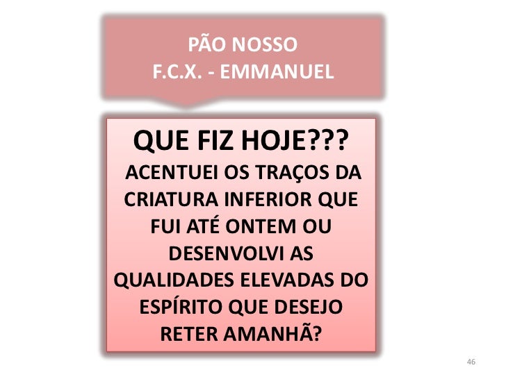 46. 46. 46<br />PÃO NOSSO<br />F.C.X. - EMMANUEL<br />QUE FIZ HOJE???<br /> ACENTUEI OS TRAÇOS DA CRIATURA INFERIOR QUE FUI ATÉ ONTEM OU DESENVOLVI AS QUALIDADES ELEVADAS DO ESPÍRITO QUE DESEJO RETER AMANHÃ?<br />