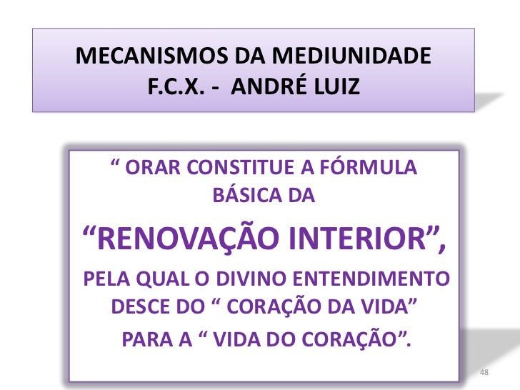 48. 48. MECANISMOS DA MEDIUNIDADE F.C.X. - ANDRÉ LUIZ<br />“ ORAR CONSTITUE A FÓRMULA BÁSICA DA <br />“RENOVAÇÃO INTERIOR”,<br /> PELA QUAL O DIVINO ENTENDIMENTO DESCE DO “ CORAÇÃO DA VIDA”<br /> PARA A “ VIDA DO CORAÇÃO”.<br />48<br />