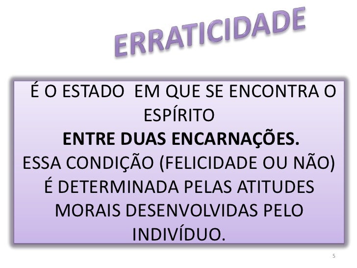 5. 5. ERRATICIDADE<br /> É O ESTADO EM QUE SE ENCONTRA O ESPÍRITOENTRE DUAS ENCARNAÇÕES.ESSACONDIÇÃO (FELICIDADE OU NÃO) É DETERMINADA PELAS ATITUDES MORAIS DESENVOLVIDAS PELO INDIVÍDUO. <br />5<br />