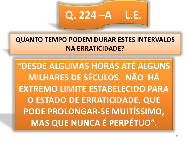 6. 6. Q. 224 –A L.E.<br />QUANTO TEMPO PODEM DURAR ESTES INTERVALOS<br />NA ERRATICIDADE?<br />“DESDE ALGUMAS HORAS ATÉ ALGUNS MILHARES DE SÉCULOS. NÃO HÁ EXTREMO LIMITE ESTABELECIDO PARA O ESTADO DE ERRATICIDADE, QUE PODE PROLONGAR-SE MUITÍSSIMO, MAS QUE NUNCA É PERPÉTUO”.<br />6<br />