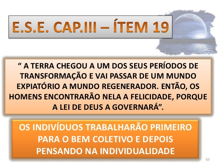 63. 63. 63<br />E.S.E. CAP.III – ÍTEM 19<br />“ A TERRA CHEGOU A UM DOS SEUS PERÍODOS DE TRANSFORMAÇÃO E VAI PASSAR DE UM MUNDO EXPIATÓRIO A MUNDO REGENERADOR. ENTÃO, OS HOMENS ENCONTRARÃO NELA A FELICIDADE, PORQUE A LEI DE DEUS A GOVERNARÁ”.<br />OS INDIVÍDUOS TRABALHARÃO PRIMEIRO PARA O BEM COLETIVO E DEPOIS PENSANDO NA INDIVIDUALIDADE<br />