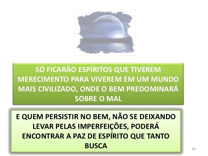 64. 64. 64<br />SÓ FICARÃO ESPÍRITOS QUE TIVEREM MERECIMENTO PARA VIVEREM EM UM MUNDO MAIS CIVILIZADO, ONDE O BEM PREDOMINARÁ SOBRE O MAL<br />E QUEM PERSISTIR NO BEM, NÃO SE DEIXANDO LEVAR PELAS IMPERFEIÇÕES, PODERÁ ENCONTRAR A PAZ DE ESPÍRITO QUE TANTO BUSCA<br />