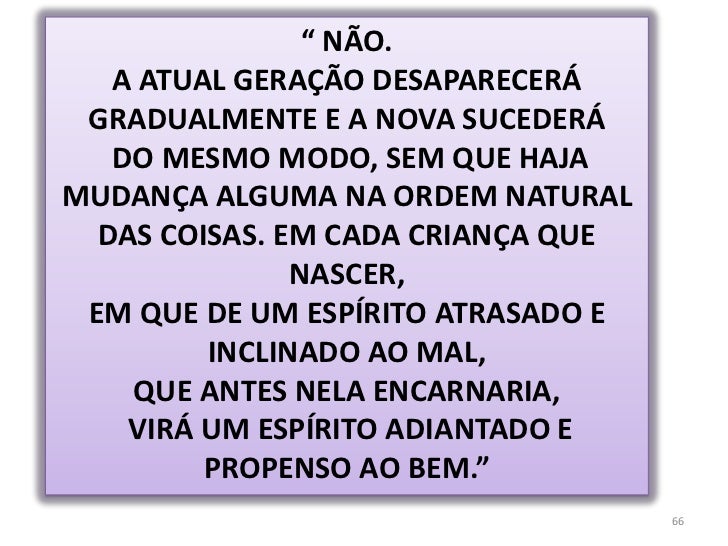 66. 66. 66<br />“ NÃO. <br />A ATUAL GERAÇÃO DESAPARECERÁ GRADUALMENTE E A NOVA SUCEDERÁ<br /> DO MESMO MODO, SEM QUE HAJA MUDANÇA ALGUMA NA ORDEM NATURAL DAS COISAS. EM CADA CRIANÇA QUE NASCER,<br />EM QUE DE UM ESPÍRITO ATRASADO E INCLINADO AO MAL, <br />QUE ANTES NELA ENCARNARIA,<br /> VIRÁ UM ESPÍRITO ADIANTADO E PROPENSO AO BEM.”<br />