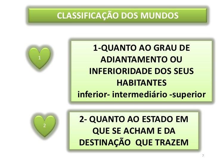 7. 7. 7<br />CLASSIFICAÇÃO DOS MUNDOS<br />1-QUANTO AO GRAU DE ADIANTAMENTO OU INFERIORIDADE DOS SEUS HABITANTES<br />inferior- intermediário -superior<br />1<br />2- QUANTO AO ESTADO EM QUE SE ACHAM E DA DESTINAÇÃO QUE TRAZEM <br />2<br />