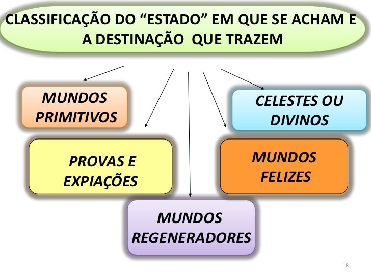8. 8. 8<br />CLASSIFICAÇÃO DO “ESTADO” EM QUE SE ACHAM E <br />A DESTINAÇÃO QUE TRAZEM<br />MUNDOS<br /> PRIMITIVOS<br />CELESTES OU<br /> DIVINOS<br /> PROVAS E<br /> EXPIAÇÕES<br />MUNDOS<br /> FELIZES<br />MUNDOS <br />REGENERADORES<br />