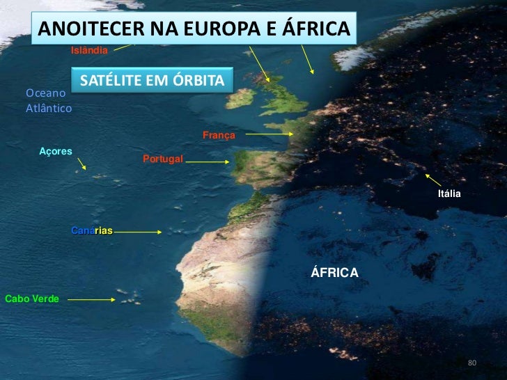 80. 80. Plataforma continental<br />ANOITECER NA EUROPA E ÁFRICA<br />Inglaterra<br />Islândia<br />SATÉLITE EM ÓRBITA<br />Oceano Atlântico<br />França<br />Açores<br />Portugal<br />Itália<br />Canárias<br />ÁFRICA<br />Cabo Verde<br />80<br />