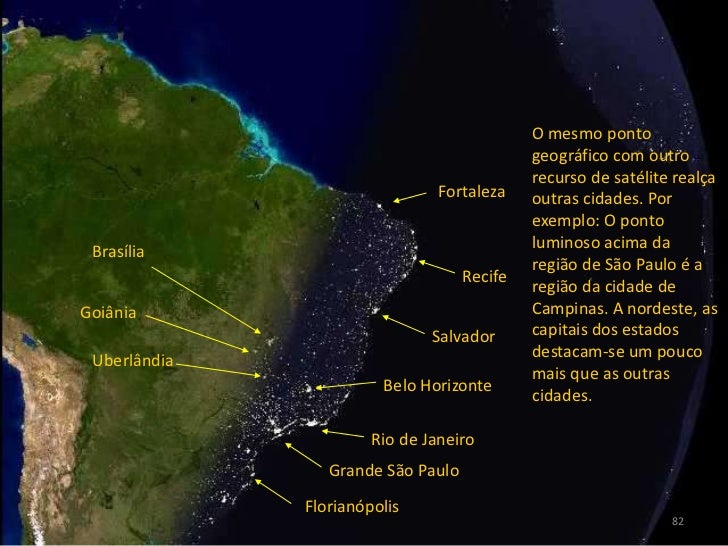 82. 82. O mesmo ponto geográfico com outro recurso de satélite realça outras cidades. Por exemplo: O ponto luminoso acima da região de São Paulo é a região da cidade de Campinas. A nordeste, as capitais dos estados destacam-se um pouco mais que as outras cidades.<br />Fortaleza<br />Brasília<br />Recife<br />Goiânia<br />Salvador<br />Uberlândia<br />Belo Horizonte<br />Rio de Janeiro<br />Grande São Paulo<br />Florianópolis<br />82<br />