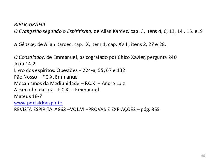 90. 90. 90<br />BIBLIOGRAFIA<br />O Evangelho segundo o Espiritismo, de Allan Kardec, cap. 3, itens 4, 6, 13, 14 , 15. e19<br />A Gênese, de Allan Kardec, cap. IX, item 1; cap. XVIII, itens 2, 27 e 28.<br />O Consolador, de Emmanuel, psicografado por Chico Xavier, pergunta 240<br />João 14-2<br />Livro dos espíritos: Questões – 224-a, 55, 67 e 132<br />Pão Nosso – F.C.X. Emmanuel<br />Mecanismos da Mediunidade – F.C.X. – André Luiz<br />A caminho da Luz – F.C.X. – Emmanuel<br />Mateus 18-7<br />www.portaldoespirito<br />REVISTA ESPÍRITA A863 –VOL.VI –PROVAS E EXPIAÇÕES – pág. 365<br />