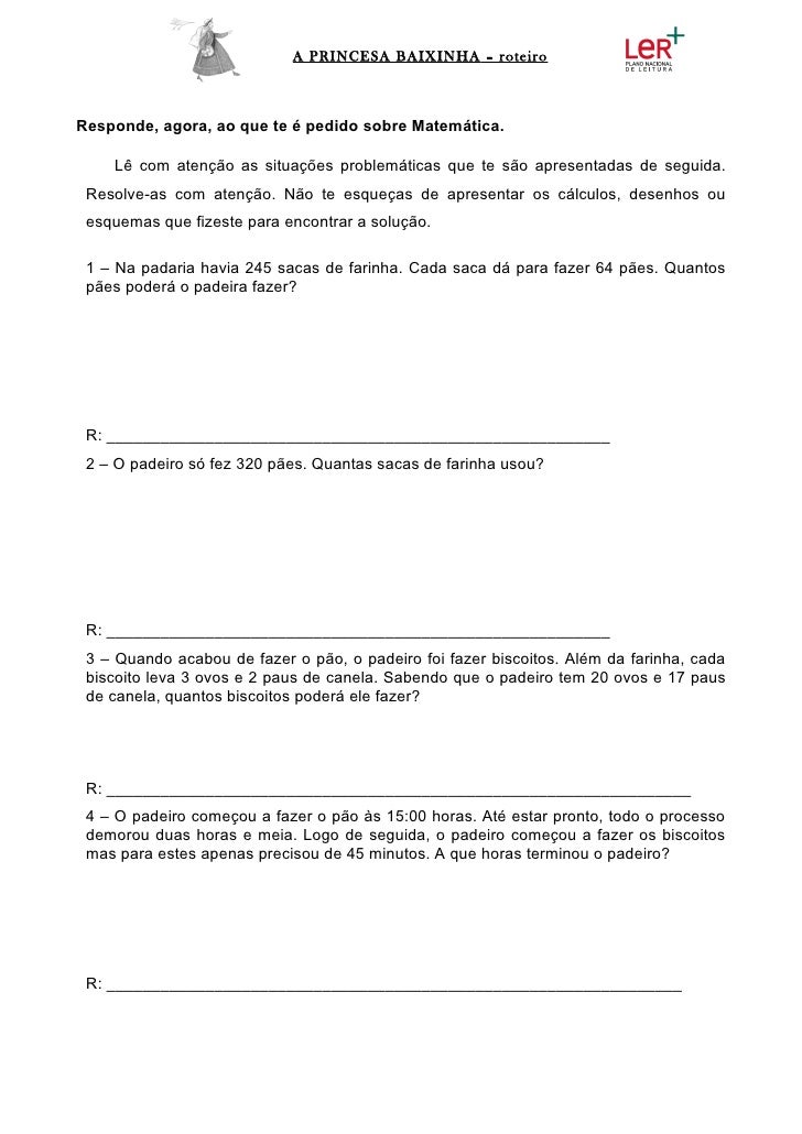 A PRINCESA BAIXINHA – roteiroResponde, agora, ao que te é pedido sobre Matemática.    Lê com atenção as situações problemá...