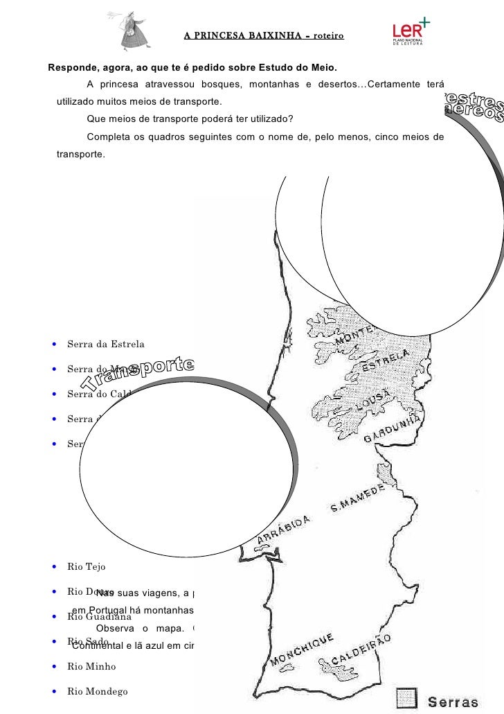 11. 11. A PRINCESA BAIXINHA – roteiroResponde, agora, ao que te é pedido sobre Estudo do Meio. A princesa atravessou bosques, montanhas e desertos…Certamente terá utilizado muitos meios de transporte. Que meios de transporte poderá ter utilizado? Completa os quadros seguintes com o nome de, pelo menos, cinco meios de transporte.• Serra da Estrela• Serra do Marão• Serra do Caldeirão• Serra do Gerês• Serra da Arrábida• Rio Tejo• Rio Douro suas viagens, a princesa passou por várias montanhas e serras. Também Nas em Portugal há montanhas e serras.• Rio Guadiana Observa o mapa. Cola lã castanha nas principais serras de Portugal• Rio Sado Continental e lã azul em cima dos principais rios.• Rio Minho• Rio Mondego