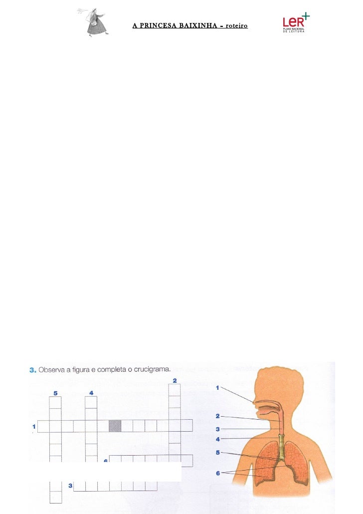 12. 12. A PRINCESA BAIXINHA – roteiro Durante a viagem, montada no seu cavalo, a princesa parou para inspirar umpouco de ar puro… Utilizou o seu Sistema Respiratório. Ajuda-a a identificar os órgãos que utilizou completando o crucigrama.