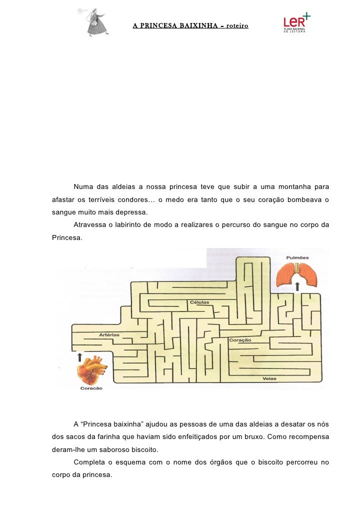 13. 13. A PRINCESA BAIXINHA – roteiro Numa das aldeias a nossa princesa teve que subir a uma montanha paraafastar os terríveis condores… o medo era tanto que o seu coração bombeava osangue muito mais depressa. Atravessa o labirinto de modo a realizares o percurso do sangue no corpo daPrincesa. A “Princesa baixinha” ajudou as pessoas de uma das aldeias a desatar os nósdos sacos da farinha que haviam sido enfeitiçados por um bruxo. Como recompensaderam-lhe um saboroso biscoito. Completa o esquema com o nome dos órgãos que o biscoito percorreu nocorpo da princesa.