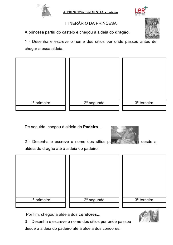 15. 15. A PRINCESA BAIXINHA – roteiro ITINERÁRIO DA PRINCESAA princesa partiu do castelo e chegou à aldeia do dragão.1 - Desenha e escreve o nome dos sítios por onde passou antes dechegar a essa aldeia. 1º primeiro 2º segundo 3º terceiroDe seguida, chegou à aldeia do Padeiro...2 - Desenha e escreve o nome dos sítios por onde passou desde aaldeia do dragão até à aldeia do padeiro. 1º primeiro 2º segundo 3º terceiroPor fim, chegou à aldeia dos condores...3 – Desenha e escreve o nome dos sítios por onde passoudesde a aldeia do padeiro até à aldeia dos condores.