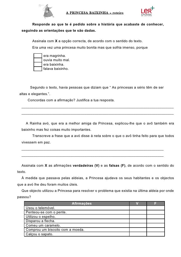 2. 2. A PRINCESA BAIXINHA – roteiro Responde ao que te é pedido sobre a história que acabaste de conhecer, seguindo as orientações que te são dadas. Assinala com X a opção correcta, de acordo com o sentido do texto. Era uma vez uma princesa muito bonita mas que sofria imenso, porque era magrinha. ouvia muito mal. era baixinha. falava baixinho. Segundo o texto, havia pessoas que diziam que “ As princesas a sério têm de ser altas e elegantes.”. Concordas com a afirmação? Justifica a tua resposta. ___________________________________________________________________________ ___________________________________________________________________________ A Rainha avó, que era a melhor amiga da Princesa, explicou-lhe que o avô também era baixinho mas fez coisas muito importantes. Transcreve a frase que a avó disse à neta sobre o que o avô tinha feito para que todos vivessem em paz. ______________________________________________________________________ ______________________________________________________________________ Assinala com X as afirmações verdadeiras (V) e as falsas (F), de acordo com o sentido dotexto. À medida que passava pelas aldeias, a Princesa ajudava os seus habitantes e os objectosque a avó lhe deu foram muitos úteis. Que objecto utilizou a Princesa para resolver o problema que existia na última aldeia por ondepassou? Afirmações V F Usou o telemóvel. Penteou-se com o pente. Utilizou o espelho. Disparou a flecha. Comeu um caramelo. Comprou um biscoito com a moeda. Calçou o sapato.