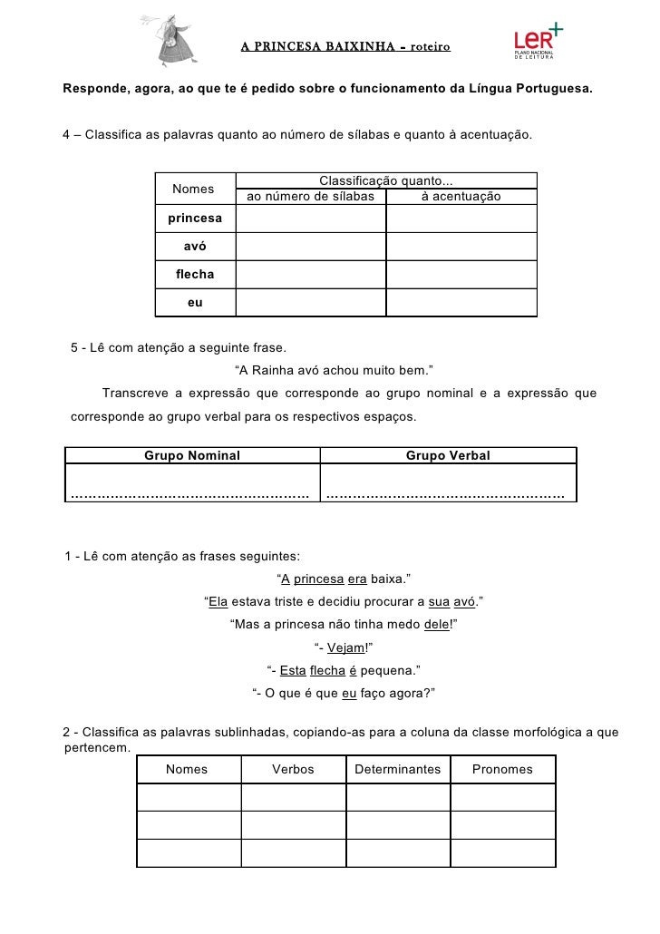 5. 5. A PRINCESA BAIXINHA – roteiroResponde, agora, ao que te é pedido sobre o funcionamento da Língua Portuguesa.4 – Classifica as palavras quanto ao número de sílabas e quanto à acentuação. Classificação quanto... Nomes ao número de sílabas à acentuação princesa avó flecha eu 5 - Lê com atenção a seguinte frase. “A Rainha avó achou muito bem.” Transcreve a expressão que corresponde ao grupo nominal e a expressão que corresponde ao grupo verbal para os respectivos espaços. Grupo Nominal Grupo Verbal ……………………………………………… ………………………………………………1 - Lê com atenção as frases seguintes: “A princesa era baixa.” “Ela estava triste e decidiu procurar a sua avó.” “Mas a princesa não tinha medo dele!” “- Vejam!” “- Esta flecha é pequena.” “- O que é que eu faço agora?”2 - Classifica as palavras sublinhadas, copiando-as para a coluna da classe morfológica a quepertencem. Nomes Verbos Determinantes Pronomes