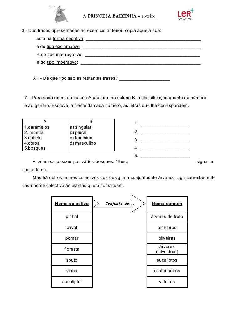6. 6. A PRINCESA BAIXINHA – roteiro3 - Das frases apresentadas no exercício anterior, copia aquela que: está na forma negativa: _____________________________________________ é do tipo exclamativo: ______________________________________________ é do tipo interrogativo: _____________________________________________ é do tipo imperativo: _______________________________________________ 3.1 - De que tipo são as restantes frases? ____________________ 7 – Para cada nome da coluna A procura, na coluna B, a classificação quanto ao número e ao género. Escreve, à frente da cada número, as letras que lhe correspondem. A B 1. ___________________ 1.caramelos a) singular 2. moeda b) plural 2. ___________________ 3.cabelo c) feminino 3. ___________________ 4.coroa d) masculino 5.bosques 4. ___________________ 5. ___________________ A princesa passou por vários bosques. “Bosque” é um nome colectivo que designa umconjunto de _________________________. Mas há outros nomes colectivos que designam conjuntos de árvores. Liga correctamentecada nome colectivo às plantas que o constituem. Nome colectivo Conjunto de... Nome comum pinhal árvores de fruto olival pinheiros pomar oliveiras árvores floresta (silvestres) souto eucaliptos vinha castanheiros eucaliptal videiras