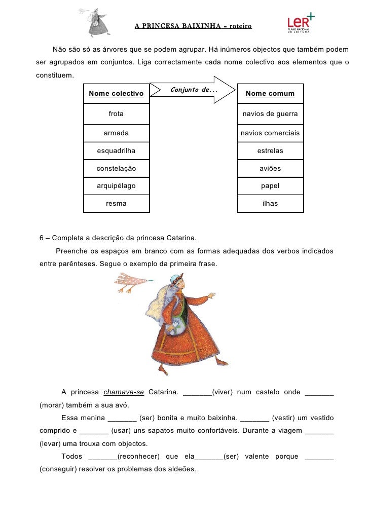 7. 7. A PRINCESA BAIXINHA – roteiro Não são só as árvores que se podem agrupar. Há inúmeros objectos que também podemser agrupados em conjuntos. Liga correctamente cada nome colectivo aos elementos que oconstituem. Conjunto de... Nome colectivo Nome comum frota navios de guerra armada navios comerciais esquadrilha estrelas constelação aviões arquipélago papel resma ilhas 6 – Completa a descrição da princesa Catarina. Preenche os espaços em branco com as formas adequadas dos verbos indicados entre parênteses. Segue o exemplo da primeira frase. A princesa chamava-se Catarina. _______(viver) num castelo onde _______ (morar) também a sua avó. Essa menina _______ (ser) bonita e muito baixinha. _______ (vestir) um vestido comprido e _______ (usar) uns sapatos muito confortáveis. Durante a viagem _______ (levar) uma trouxa com objectos. Todos _______(reconhecer) que ela_______(ser) valente porque _______ (conseguir) resolver os problemas dos aldeões.