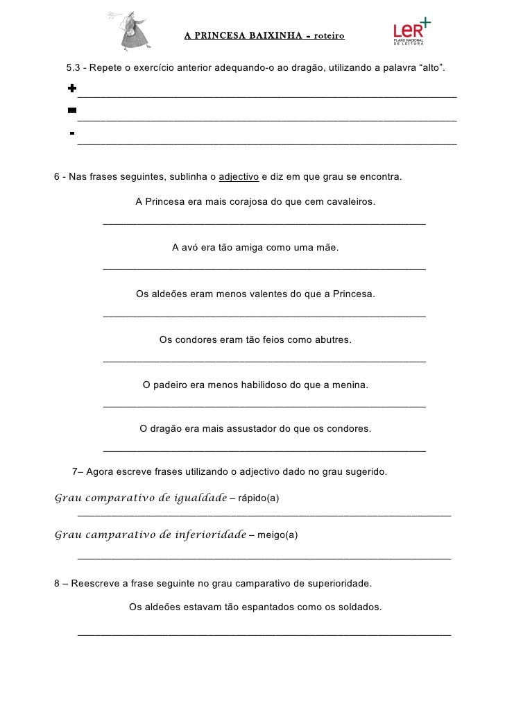 9. 9. A PRINCESA BAIXINHA – roteiro 5.3 - Repete o exercício anterior adequando-o ao dragão, utilizando a palavra “alto”. +___________________________________________________________________ =___________________________________________________________________ - ___________________________________________________________________6 - Nas frases seguintes, sublinha o adjectivo e diz em que grau se encontra. A Princesa era mais corajosa do que cem cavaleiros. _________________________________________________________ A avó era tão amiga como uma mãe. _________________________________________________________ Os aldeões eram menos valentes do que a Princesa. _________________________________________________________ Os condores eram tão feios como abutres. _________________________________________________________ O padeiro era menos habilidoso do que a menina. _________________________________________________________ O dragão era mais assustador do que os condores. _________________________________________________________ 7– Agora escreve frases utilizando o adjectivo dado no grau sugerido.Grau comparativo de igualdade – rápido(a) __________________________________________________________________Grau camparativo de inferioridade – meigo(a) __________________________________________________________________8 – Reescreve a frase seguinte no grau camparativo de superioridade. Os aldeões estavam tão espantados como os soldados. __________________________________________________________________