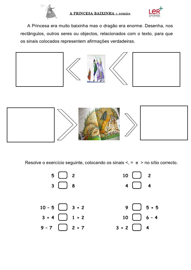 10. 10. A PRINCESA BAIXINHA – roteiro A Princesa era muito baixinha mas o dragão era enorme. Desenha, nosrectângulos, outros seres ou objectos, relacionados com o texto, para queos sinais colocados representem afirmações verdadeiras. Resolve o exercício seguinte, colocando os sinais <, = e > no sítio correcto. 5  2 10  2 3  8 4  4 10 – 5  3 + 2 9  5 + 5 3 + 4  1 + 2 10  6 – 4 9 – 7  2 + 7 3 + 2  4