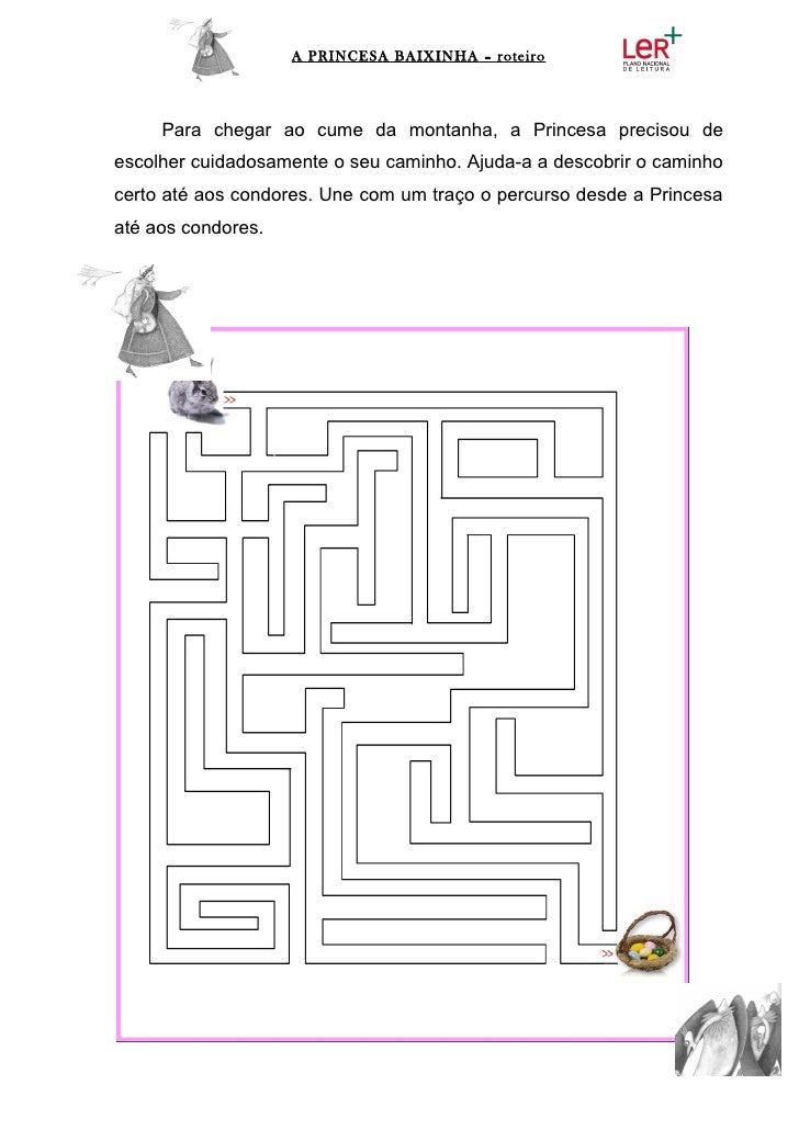 11. 11. A PRINCESA BAIXINHA – roteiro Para chegar ao cume da montanha, a Princesa precisou deescolher cuidadosamente o seu caminho. Ajuda-a a descobrir o caminhocerto até aos condores. Une com um traço o percurso desde a Princesaaté aos condores.