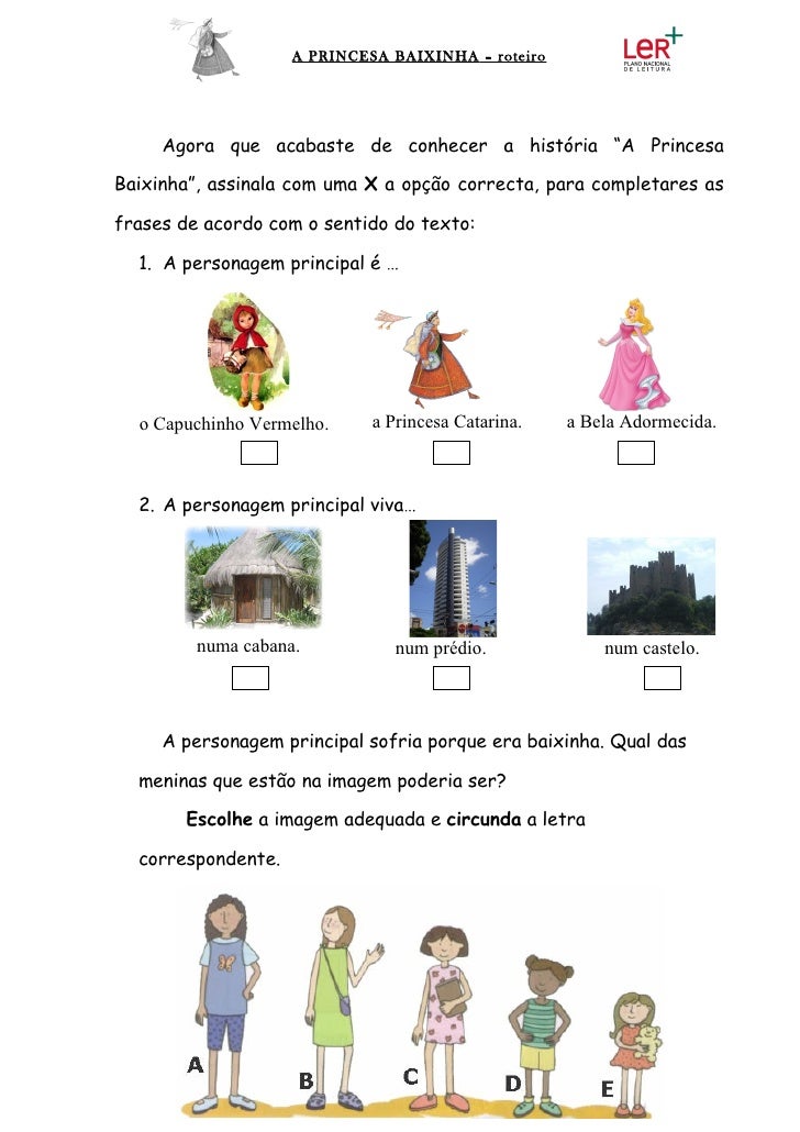 5. 5. A PRINCESA BAIXINHA – roteiro Agora que acabaste de conhecer a história “A PrincesaBaixinha”, assinala com uma X a opção correcta, para completares asfrases de acordo com o sentido do texto: 1. A personagem principal é … o Capuchinho Vermelho. a Princesa Catarina. a Bela Adormecida. 2. A personagem principal viva… numa cabana. num prédio. num castelo. A personagem principal sofria porque era baixinha. Qual das meninas que estão na imagem poderia ser? Escolhe a imagem adequada e circunda a letra correspondente.