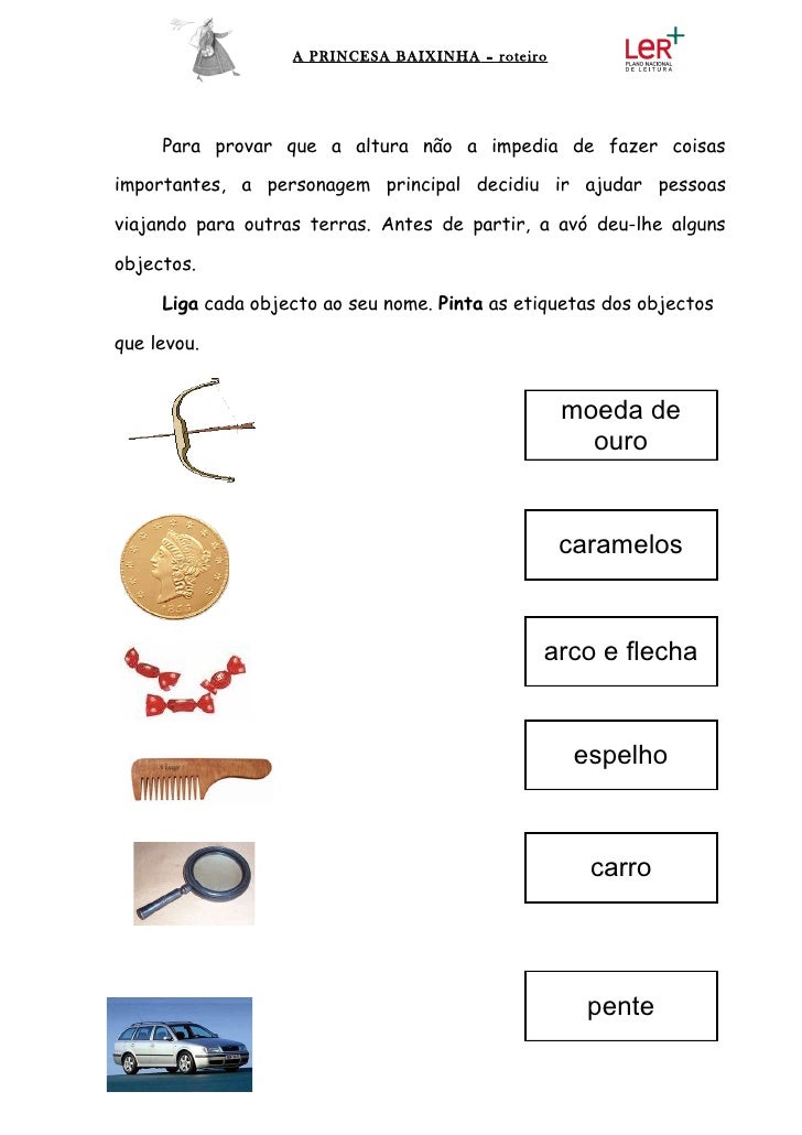 6. 6. A PRINCESA BAIXINHA – roteiro Para provar que a altura não a impedia de fazer coisasimportantes, a personagem principal decidiu ir ajudar pessoasviajando para outras terras. Antes de partir, a avó deu-lhe algunsobjectos. Liga cada objecto ao seu nome. Pinta as etiquetas dos objectosque levou. moeda de ouro caramelos arco e flecha espelho carro pente