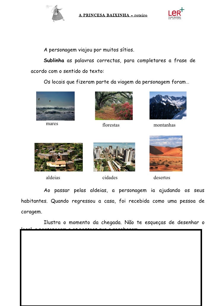 7. 7. A PRINCESA BAIXINHA – roteiro A personagem viajou por muitos sítios. Sublinha as palavras correctas, para completares a frase de acordo com o sentido do texto: Os locais que fizeram parte da viagem da personagem foram… mares florestas montanhas aldeias cidades desertos Ao passar pelas aldeias, a personagem ia ajudando os seushabitantes. Quando regressou a casa, foi recebida como uma pessoa decoragem. Ilustra o momento da chegada. Não te esqueças de desenhar olocal, a personagem e as pessoas que a receberam.